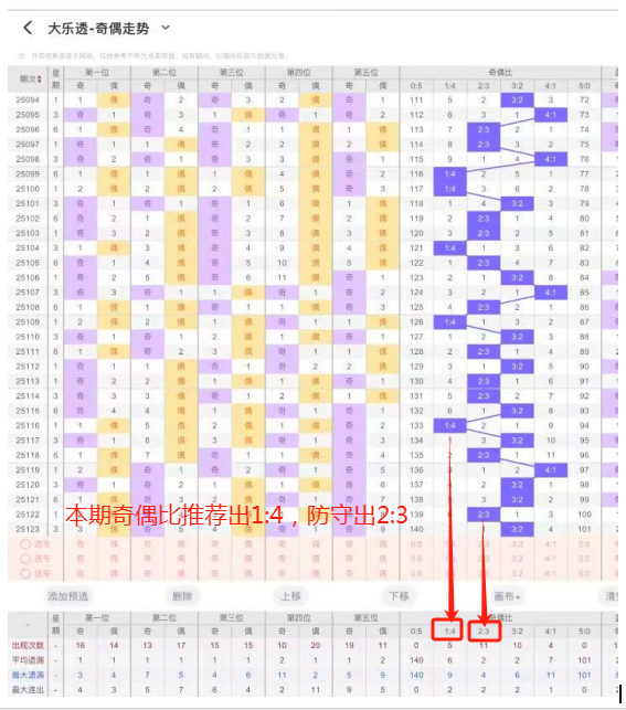 4、奇偶比:上期开出3个奇数:13 25 31,出2个偶数08 24,奇偶比为3:2,整体看偶数走势强势,本期重点看偶数继续出号,本期推荐出1:4,防守出2:3,本期重点关注2:3 。