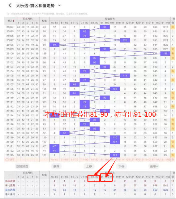 前区奖号开出0个重号,连号开出1个,奇偶比为3:2,和值为101 ,跨度为23,三个区的区间比为1:2:2,后区开出1个重号,出1个大号。