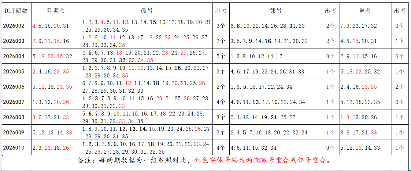 如图,以近两期数据为一组,进行对比分析,相同的孤号、邻号可能在下期开出。本期参考孤号:5.6.7.8.9.10.11.15.16.20.21.22.23.24.28.29.30.31.32.33.34.35;邻号:1.4.12.14.17.19.25.27。重点关注:孤邻号重合号码:***(会员专区可见)。个人分析,仅供参考。