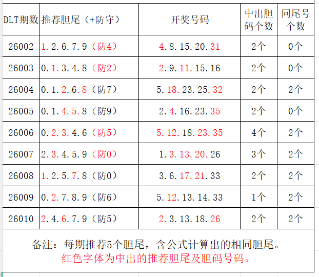 分享第三个数据分析:依据推荐的胆尾,推定胆码号码。每期计算出5个胆尾,做为推荐胆尾。以近10期推荐胆尾的统计数据为例: