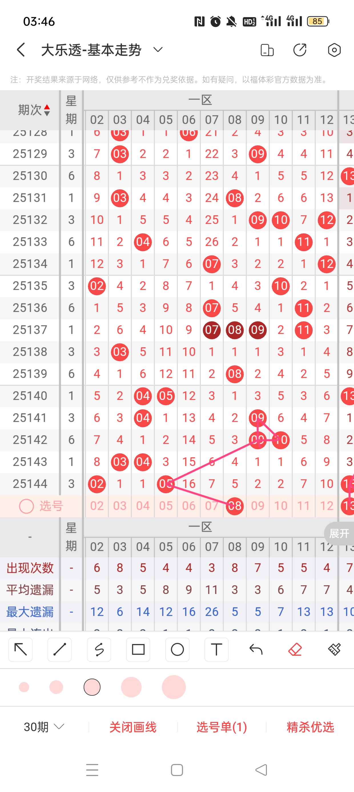 后区(1-12)近133期本区012路72:83:75,1路热度高,本期着重0/2路。1已遗漏5期,与5之间呈现向左遗漏递减态势,需防。