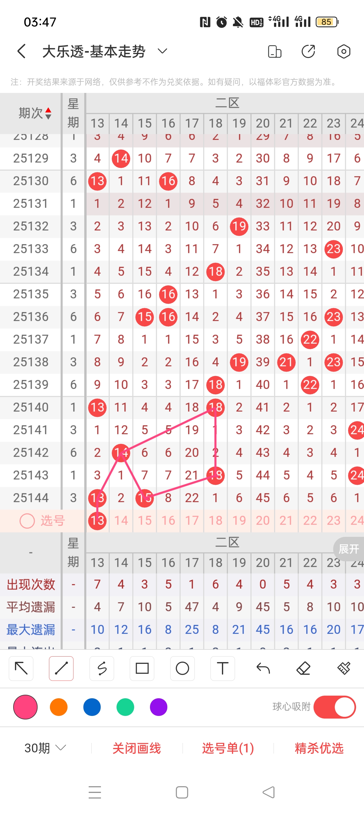 25144期开奖结果:2、5、13、15、28+5、8,奇偶比3:2,大小比1:4,和值63,012路122,邻孤传0邻5孤0传,同尾号5、15,传号无,连号无。总结完毕,下面开始本期分析。