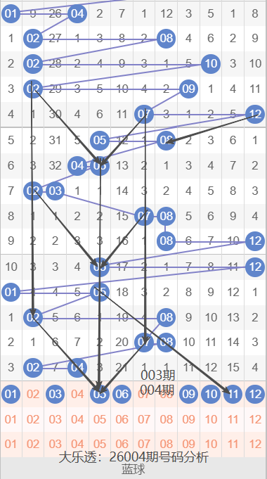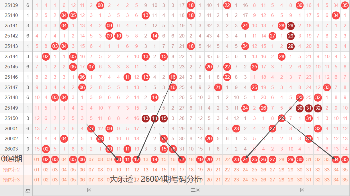 通过上期号码的简单分析,我们看下26004期红色号码球的总体走势,如下图: