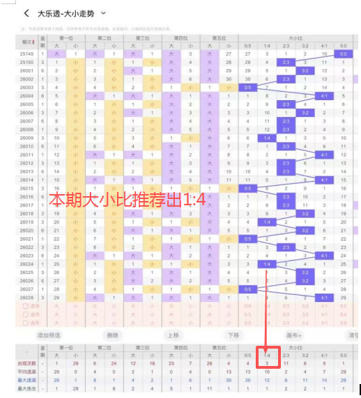 5、大小比:上期开出大小比为4:1,近119期开出4:2出现25次,3:2出现49次,2:3出现50次,1:4出现31次,5:0出现4次,本期推荐出1:4。
