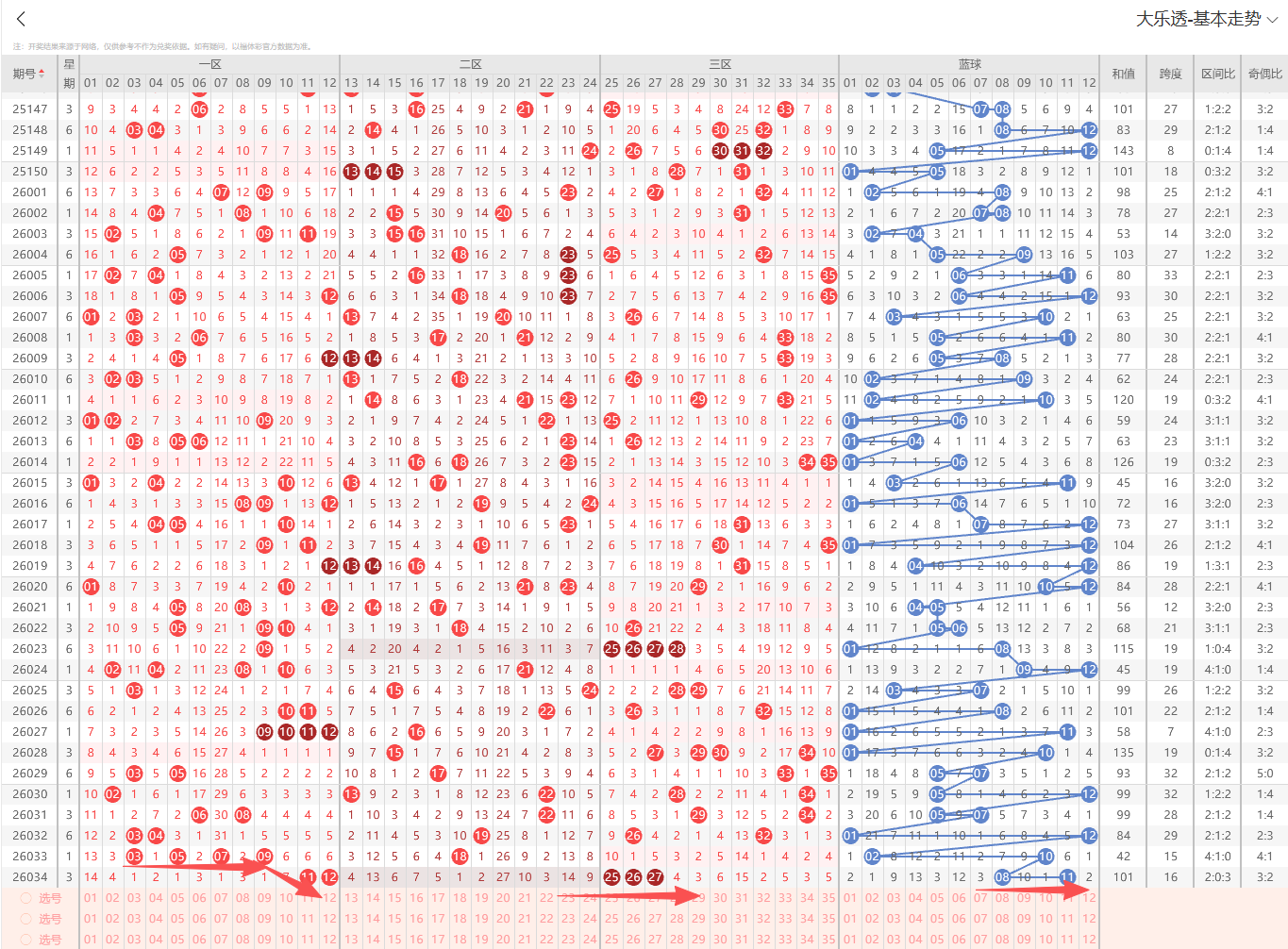 1、前区特征分析:(通过整体走势不难看出每期开奖号都具备以下明显的特征点)