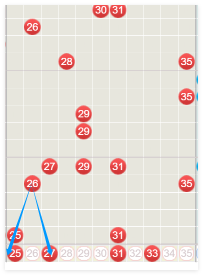 接着,我们重点看一下三分区大号上期开了25和31,那么这个地方呢,是要注意一下2531是有重的一个可能性。那么,不管是25重和31重,它的组合是不同的。那么,我们要是重25,那么25这个位置呢,就会产生组合,比如22.25和23.25这样的组合。如果是说31重的话,我们就要考虑31重的话去组合的话,还是有点难度,所以我们建议的话还是重25比较好。三字头呢,本期的话还是要注意可能还会继续断呢。