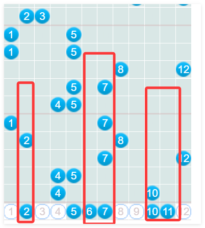 接下来看一下后区,后区上期开了两个偶数04和10。那么本期的话,我们还是要考虑有一大一小或者是两小或者是两大这样的三种可能性。如果说是一大一小,那么我们还是要考虑这个小号,可能会是在02还有这个04这个位置,大号就在091011,这是后区的出号点。当然,04~10之间,5678这个地方呢,要注意一下这个06 07, 所以后期的组合比较多。