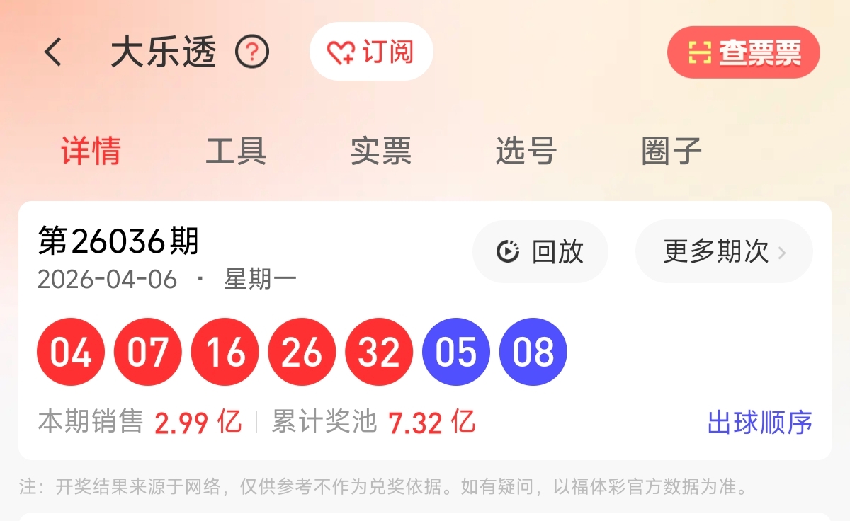 首先让我们回顾一下上期大乐透26036期的开奖为04、07、16、26、32,蓝球05、08。前区和值85,前区跨28,区间比为2:1:2,奇偶比为1:4。