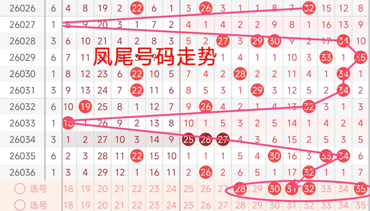 红球三区推荐(25~35):上期红三区开出2枚号码,号码为26、32,本期红三区建议出号1-2枚,本期红三区推荐关注号28、30、31、32、35。