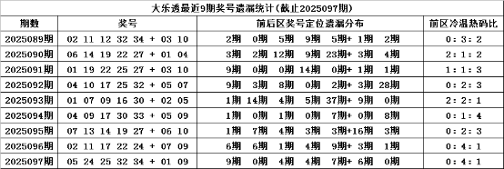 上期没有开出冷码,近9期冷码表现非常活跃,目前前区有10个冷码:03151820212326282931,本期注意温热号码反弹,防冷码全部轮空。