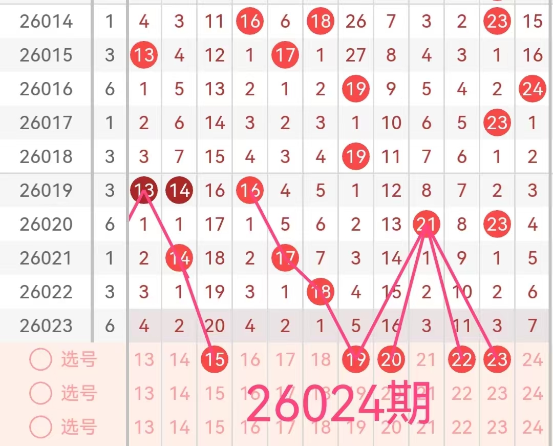 2. 二区(13-24):上期该区间没有任何号码开出,形成短暂的断区现象。根据历史开奖来看,近期该区间活跃度较低,本期预计会有1-2个号码会回补开出。特别是那些遗漏次数较大的号码15、20、22和该区间内近期表现较好的号码19、23这个号码在走势上表现出一定的稳定性,且与前几期出号形成呼应,有望出现在本期开奖中。