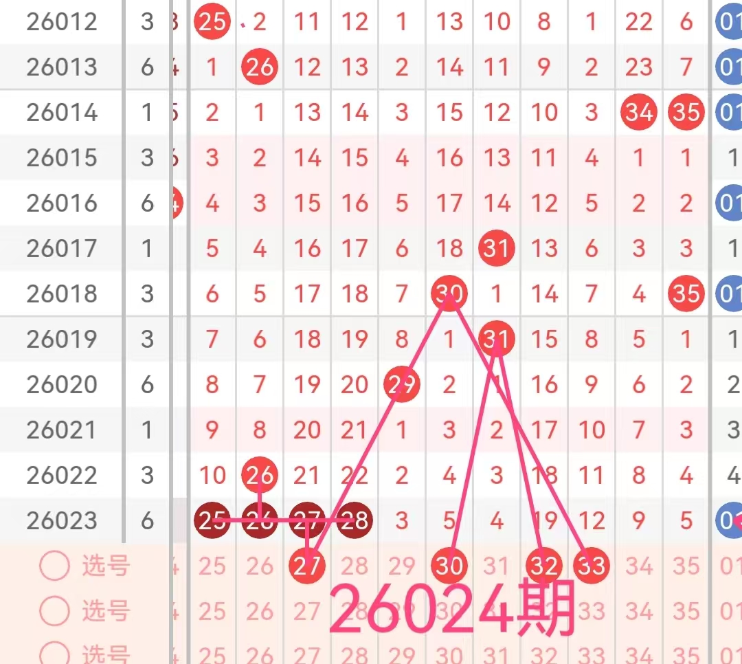 2. 凤尾号码分析:凤尾号码(前区最大号码)上期是28。这是一个中等偏大的凤尾,过去十期内,凤尾号码多集中在18到35之间,其中3字头号码表现较为活跃。因此,本期应重点关注18-35区间的数字,特别是号码27、30、32、33
