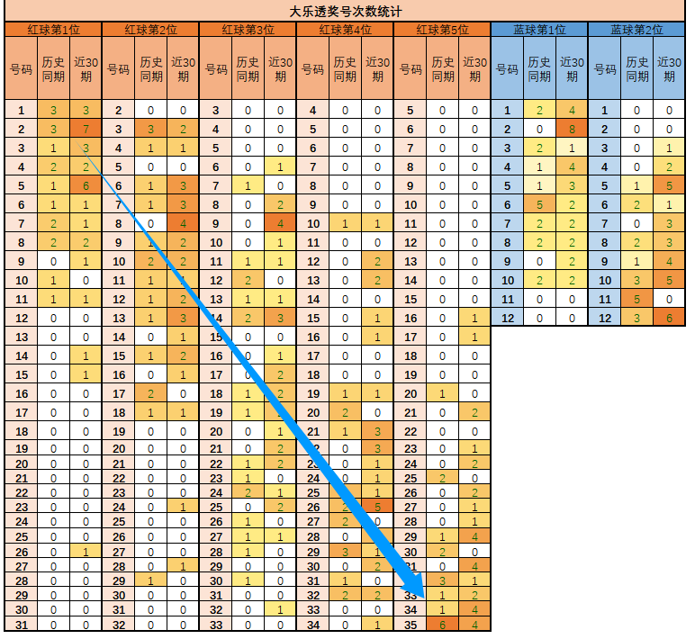 1、如上图,背景越深色,说明出号频率越高。
