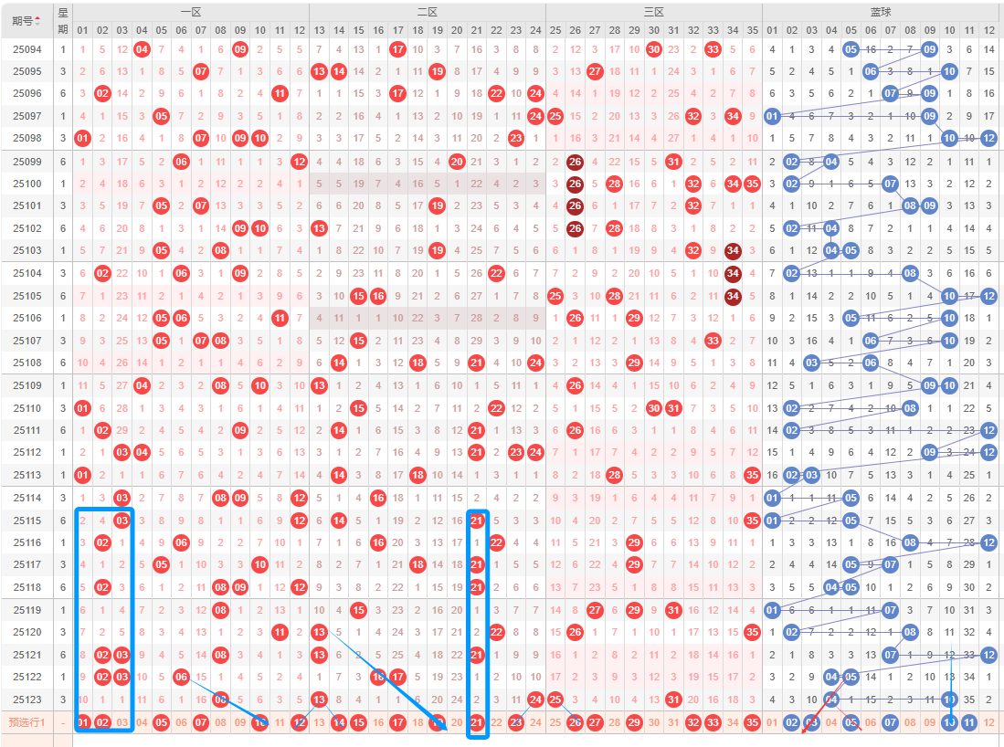 推荐大底:一区:1-2-5-7-10,二区:14-15-17-19-21;三区:26-27-29-33-35;蓝区:2-3-5-7-10