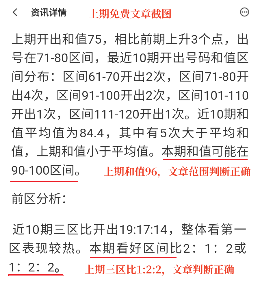 上期和值96,三区比1:2:2,免费文章和值范围和三区比均判断正确。