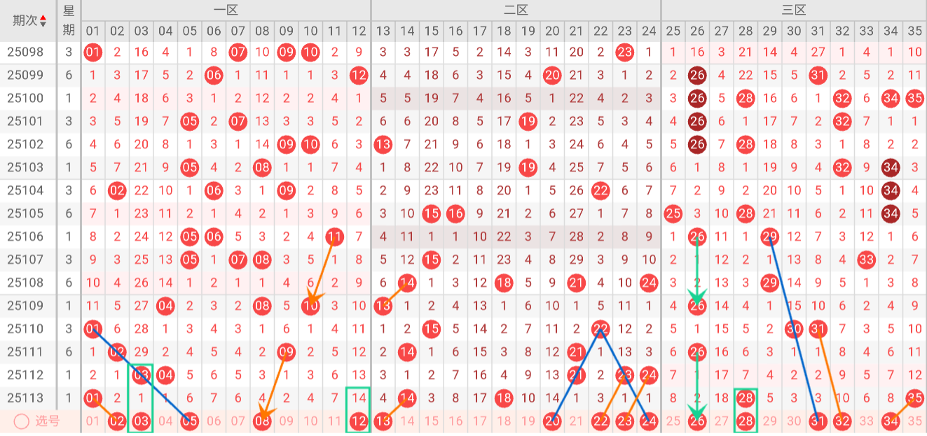 三区(25-35)分析:上期该区开出号码 28 35,近10期占比28%,与上期相比无变化。本期无三斜连号趋势,隔码斜连走势:31。三区平稳期后突然断档,随后立即反弹至2码。这种断档-反弹模式验证了三区能量的脉冲式释放特征。推荐关注号码:26、28、31、32、34。