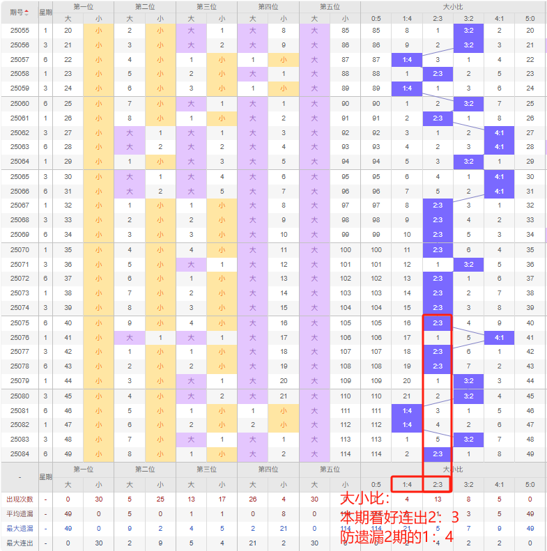 上期大小比:2:3,近10期大小比出现情况:2:3、4:1、2:3、2:3、3:2、3:2、1:4、1:4、3:2、2:3,最近10期出现3期3:2,出现4期2:3,出现1期4:1,出现2期1:4,出现0期5:0,出现0期0:5,根据近10期规律本期看好10期循环的2:3,防遗漏2期开出1:4,综上所述推荐大小比推荐:1:4,重点关注:2:3。
