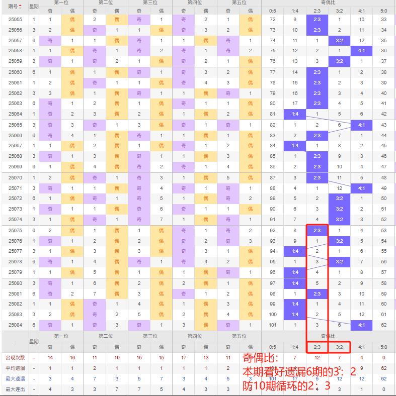上期奇偶比:4:1,近10期奇偶比出现情况:2:3、3:2、1:4、3:2、1:4、1:4、2:3、1:4、1:4、4:1,最近10期出现2期3:2,出现2期2:3,出现1期4:1,出现5期1:4,出现0期5:0,出现0期0:5,根据近10期规律本期看好遗漏6期的3:2,防10期循环的2:3,综上所述推荐奇偶比推荐:2:3,重点关注:3:2。