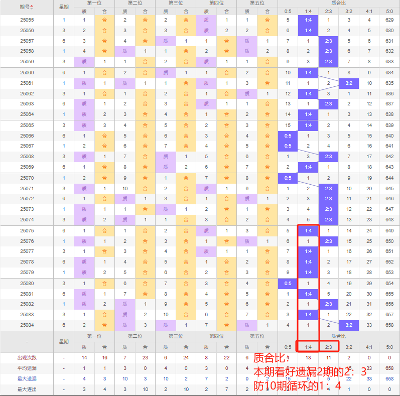 上期质合比:3:2,近10期质合比出现情况:1:4、2:3、1:4、1:4、1:4、0:5、1:4、2:3、1:4、3:2,最近10期出现1期3:2,出现2期2:3,出现0期4:1,出现6期1:4,出现0期5:0,出现1期0:5,根据近10期规律本期看好遗漏2期的2:3,防10期循环的1:4,综上所述推荐质合比推荐:1:4,重点关注:2:3。