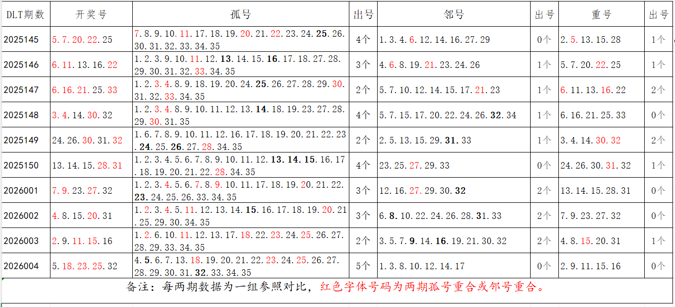 如图,以近两期数据为一组,进行对比分析,相同的孤号、邻号可能在下期开出。本期参考孤号:1.2.3.7.8.9.10.11.12.13.14.15.16.20.21.27.28.29.30.34.35;邻号:4.6.17.19.22.24.26.31.33。重点关注:孤邻号重合号码:***(会员专区可见)。个人分析,仅供参考。