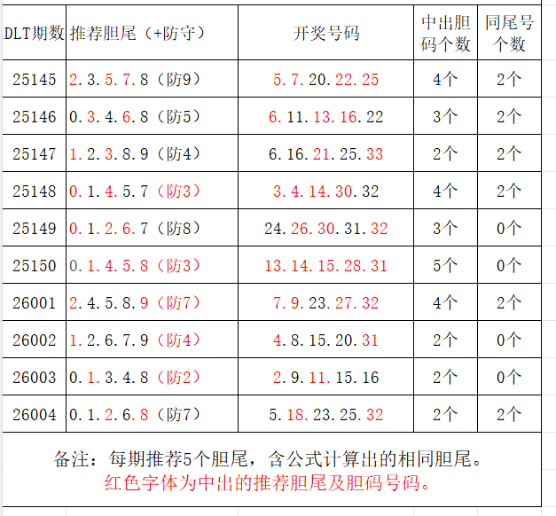 如图,每期推荐胆尾中出1-4个。上期推荐胆尾中出2尾2码!推荐胆尾是按照公式计算的顺序,不定位红球号码的顺序。本期推荐胆尾:0尾/1尾/4尾/8尾/5尾,加推防守胆尾+胆码号码:***(会员专区可见)。个人分析,仅供参考。
