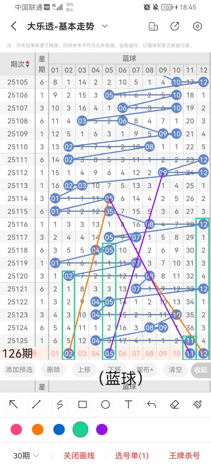 小梁根据图中画线思路,最后给大家汇总提供一下大乐透本期红球、蓝球数据,供大家参考: