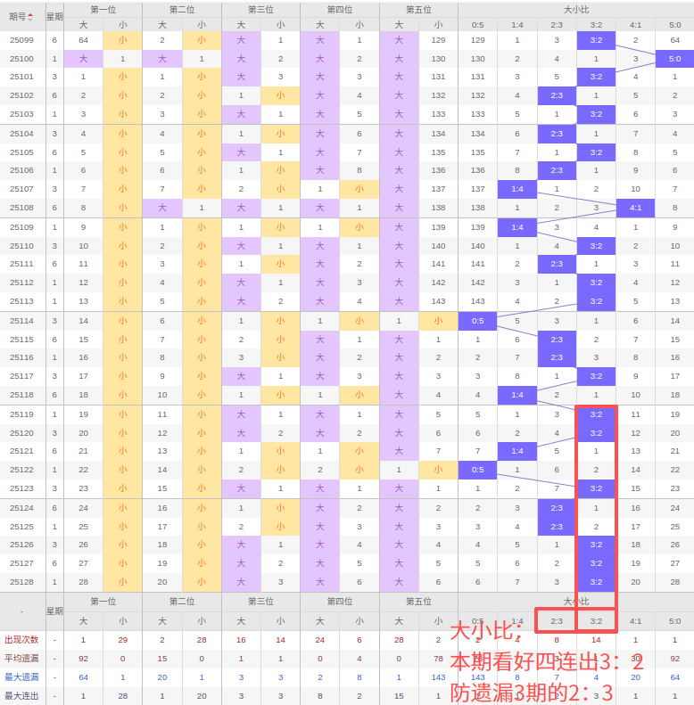 上期大小比:3:2,近10期大小比出现情况:3:2、3:2、1:4、0:5、3:2、2:3、2:3、3:2、3:2、3:2,最近10期出现6期3:2,出现2期2:3,出现0期4:1,出现1期1:4,出现0期5:0,出现1期0:5,根据近10期规律本期看好四连出的3:2,防遗漏3期开出2:3,综上所述推荐大小比推荐:2:3,重点关注:3:2。