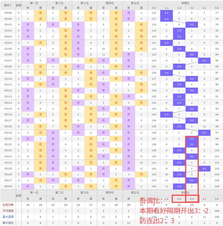 上期奇偶比:2:3,近10期奇偶比出现情况:4:1、3:2、3:2、2:3、3:2、2:3、4:1、2:3、3:2、2:3,最近10期出现4期3:2,出现4期2:3,出现2期4:1,出现0期1:4,出现0期5:0,出现0期0:5,根据近10期规律本期看好隔期出3:2,防连出2:3,综上所述推荐奇偶比推荐:2:3,重点关注:3:2。