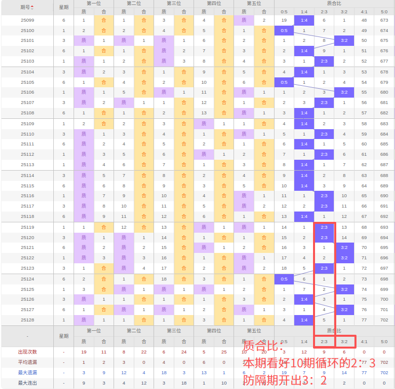 上期质合比:1:4,近10期质合比出现情况:2:3、2:3、3:2、2:3、2:3、0:5、3:2、1:4、3:2、1:4,最近10期出现4期3:2,出现3期2:3,出现0期4:1,出现2期1:4,出现0期5:0,出现1期0:5,根据近10期规律本期看好10期循环的2:3,防1隔期出3:2,综上所述推荐质合比推荐:3:2,重点关注:2:3。