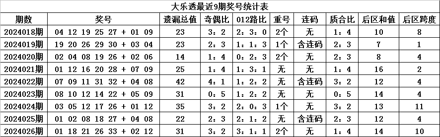 体彩大乐透第2024026期奖号为:01 18 21 26 33 + 02 12,各位号码遗漏期数分别为:0期、0期、11期、1期、19期+5期、1期,前区号码遗漏总期数为31期,012路比为3:1:1,奇偶比为3:2,包含2个重复号码:01、18。后区号码遗漏总期数为6期,和值为14,跨度为10。