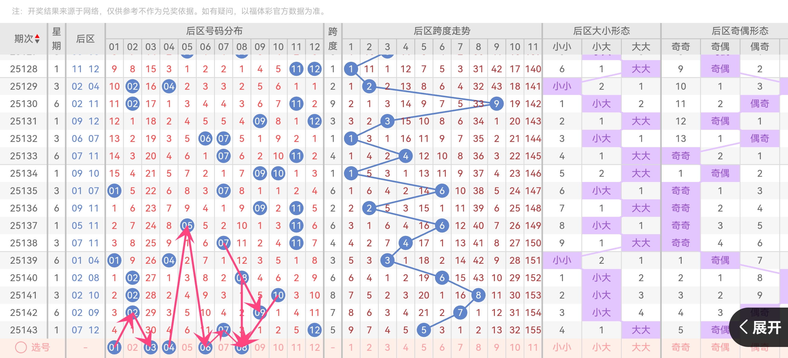 后区分析 :07(1路)、12(0路),路数均衡,但和值偏高(19),本期预测回落至低位(目标10-14点)。