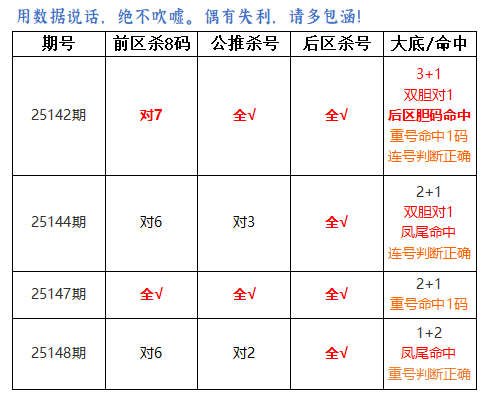 上期前区杀8码全对6,公推前区杀4码全对2,后区杀3码全对。会员文章中凤尾命中,重号判断正确,大底命中1+2,本期再接再厉!