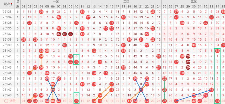 一区(1-12)分析:上期该区开出号码03 04,近10期一区出号占36% ,与上期相比不变。本期无三斜连号趋势,隔码斜连走势:05 07。