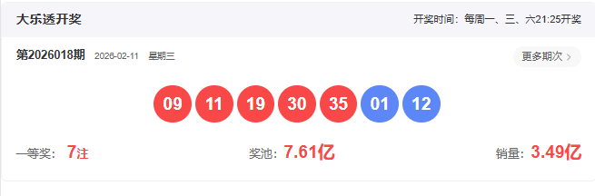 开奖号码:09 11 19 30 35- 01 12
