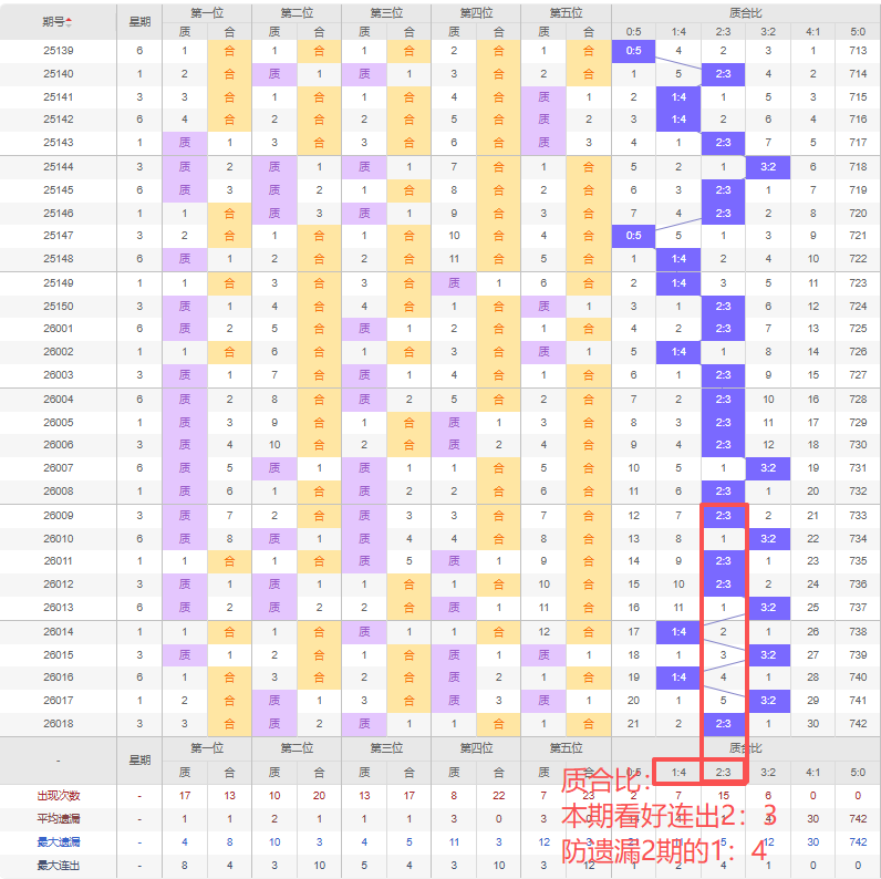 上期质合比:2:3,近10期质合比出现情况:2:3、3:2、2:3、2:3、3:2、1:4、3:2、1:4、3:2、2:3,最近10期出现4期3:2,出现4期2:3,出现0期4:1,出现2期1:4,出现0期5:0,出现0期0:5,根据近10期规律本期看好连出的2:3,防遗漏2期开出1:4,综上所述推荐质合比推荐:1:4,重点关注:2:3。