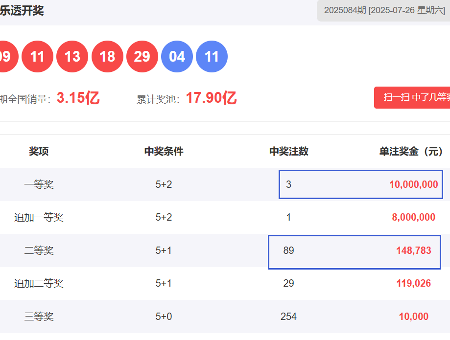 大家好,我是一起彩读者九九锦鲤,今天是2025年7月27日,明天是大乐透2025085期开奖,首先我们回顾一下084期啊,大乐透的一个开奖结果啊,前区号码开0911131829后区0411全国一等奖。中出3注,单注奖金1000万,二等奖89注,单注奖金14.8万
