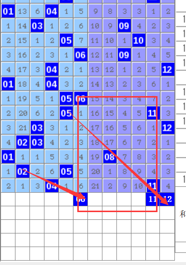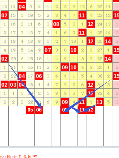 现在呢,我们正式开始分析超级大乐透085期前区的一个号码,那么首先还是看一下1~12这个前面一分区的这个号码分析。那么上一期开了091113,那么本期的话考虑重号,那么考虑重号的话,只有两个0911可以考虑,那么根据0911的重号情况,我们去进行组合。组合的话,我们可以看出有斜连号码06,包括一个冷号05,所以说一分区的组合情况呢,就有05060911,我们把这个12号也拿下来,这个12号出的可能性不是很大,但是呢,它也是根据09.12组合