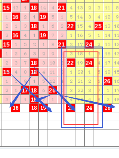 现在我们看一下这个12~24啊,这也是一个非常关键的一个中区,那么上期重了一个18号,而后本期这个18呢,还是有可能重的,因为我们根据13.18位置关系,那么就有可能会把18继续重复下来。那么我们就应该根据18号左右进行组合,首要的组合呢,就是16.18.19这是一个组合,另外呢,还有一个18.19.22这也是一个组合