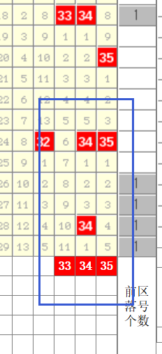 最后,我们看一下最后一个分区,从24~35,那么上一期只开了一个29。这个29的话,如果我们按这个342924的话,这样的西点那个24也是一个斜连号。但是,如果说我这个29往大号方向走,那么三字头就有可能会开出号码。那我们就要考虑333435继续回补