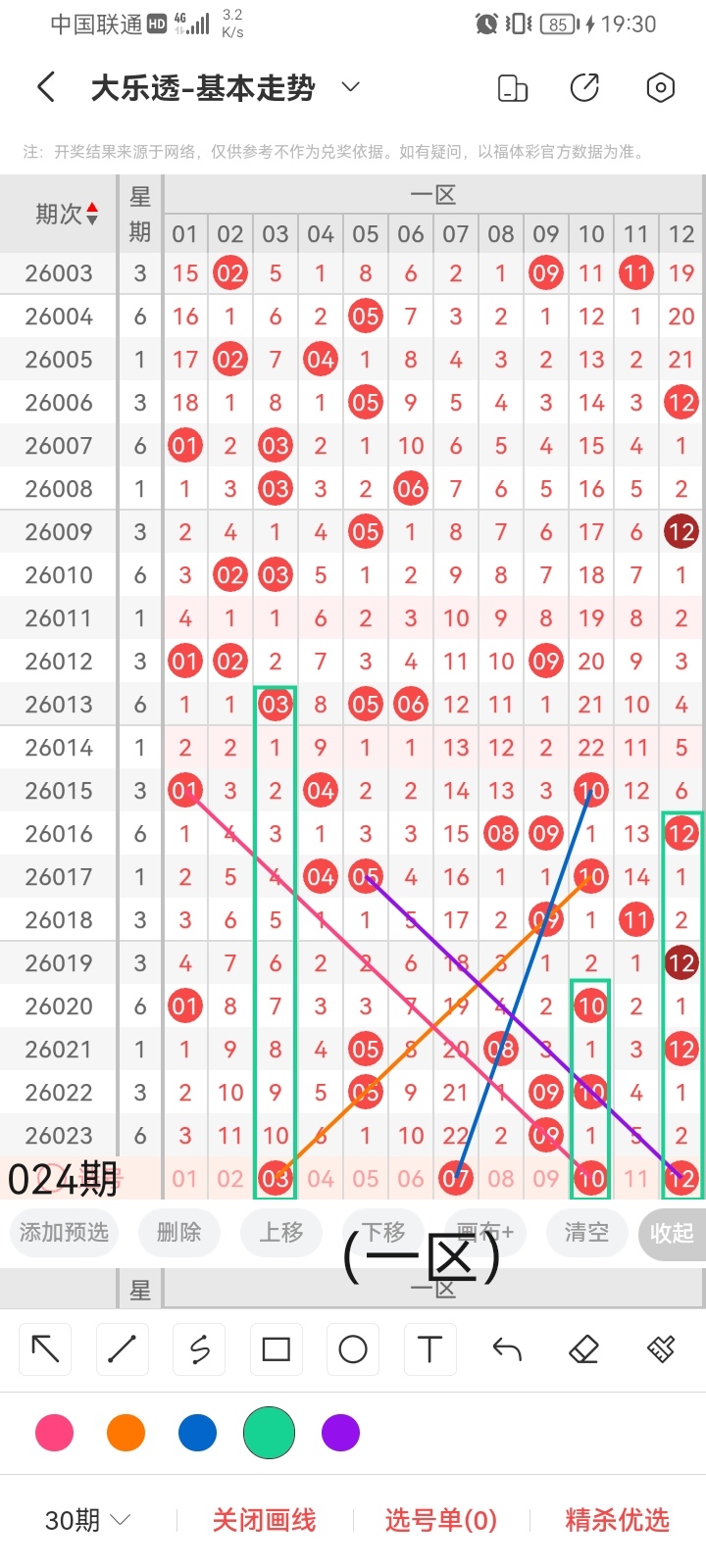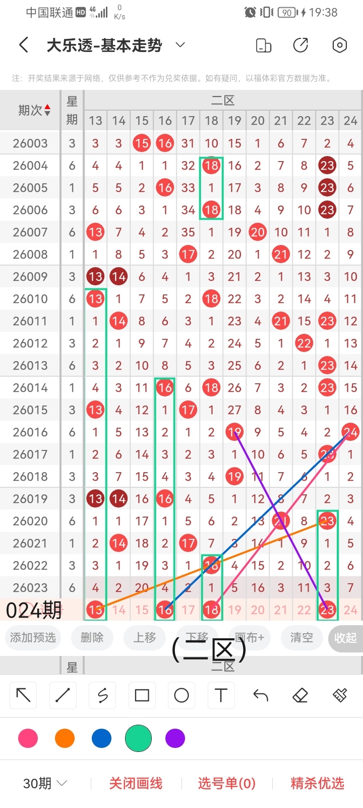 通过以上对上期的简单回顾,下面进入大乐透第2026024期(下面简称本期)的选号分析: