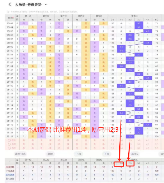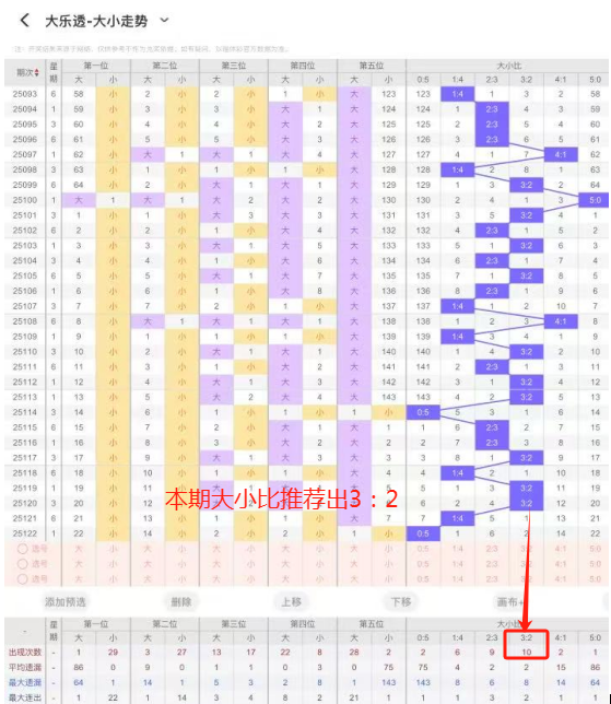 6、大小比:上期开出大小比为1:4,近80期开出4:1出现19次,3:2出现31次,2:3出现42次,1:4出现27次,5:0出现3次,本期推荐出4:1,防守出3:2,本期重点推荐出3:2 。