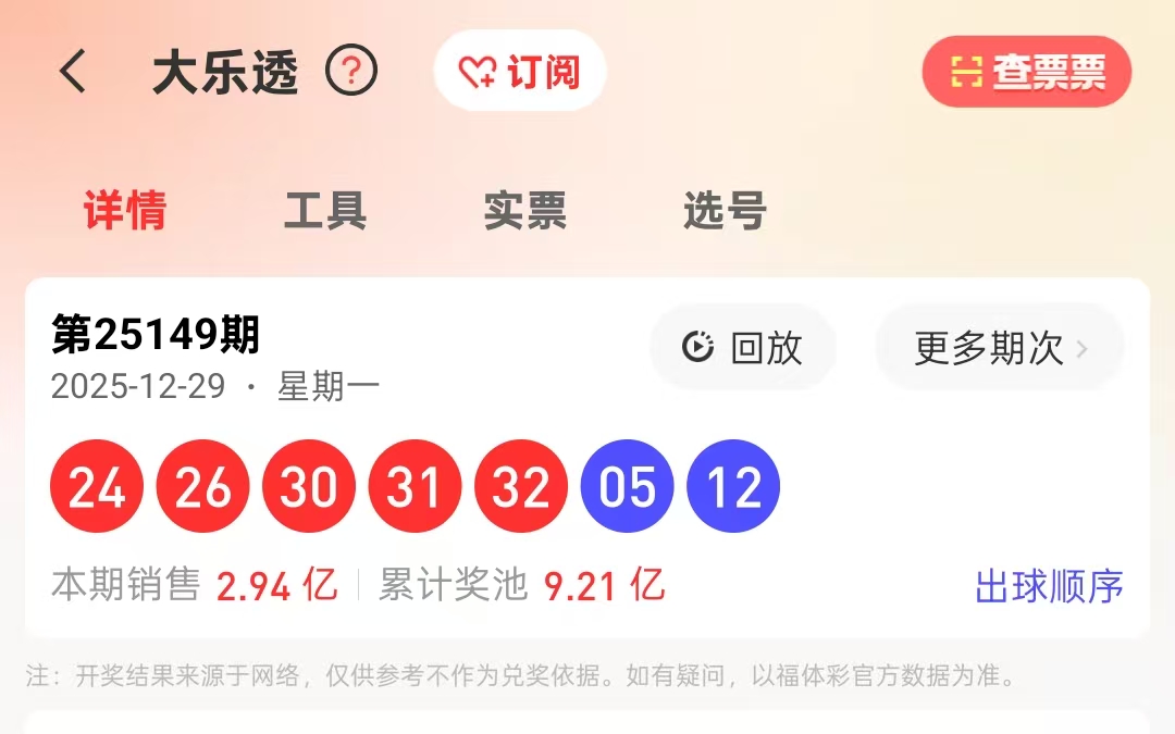上期大乐透开奖结果:24.26.30.31.32.05.12