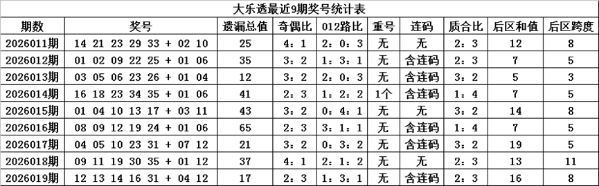 后区跨度:后区近9期跨度分别开出8-5-3-5-8-5-5-11-8,跨度奇偶比为6:3,上期跨度下降3个点位,本期防跨度再次下降,注意奇数跨度出现,关注跨度3。