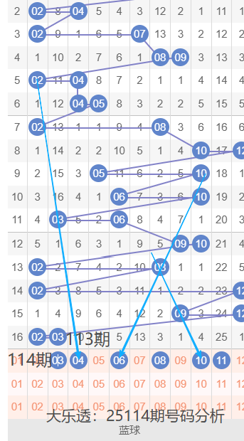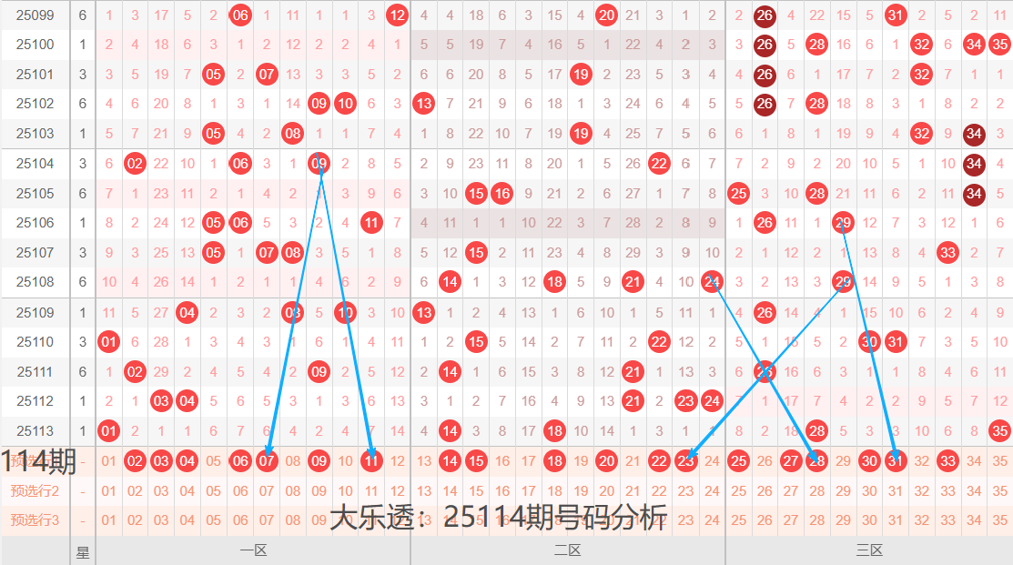 通过上期号码的简单分析,我们看下25114期红色号码球的总体走势,如下图: