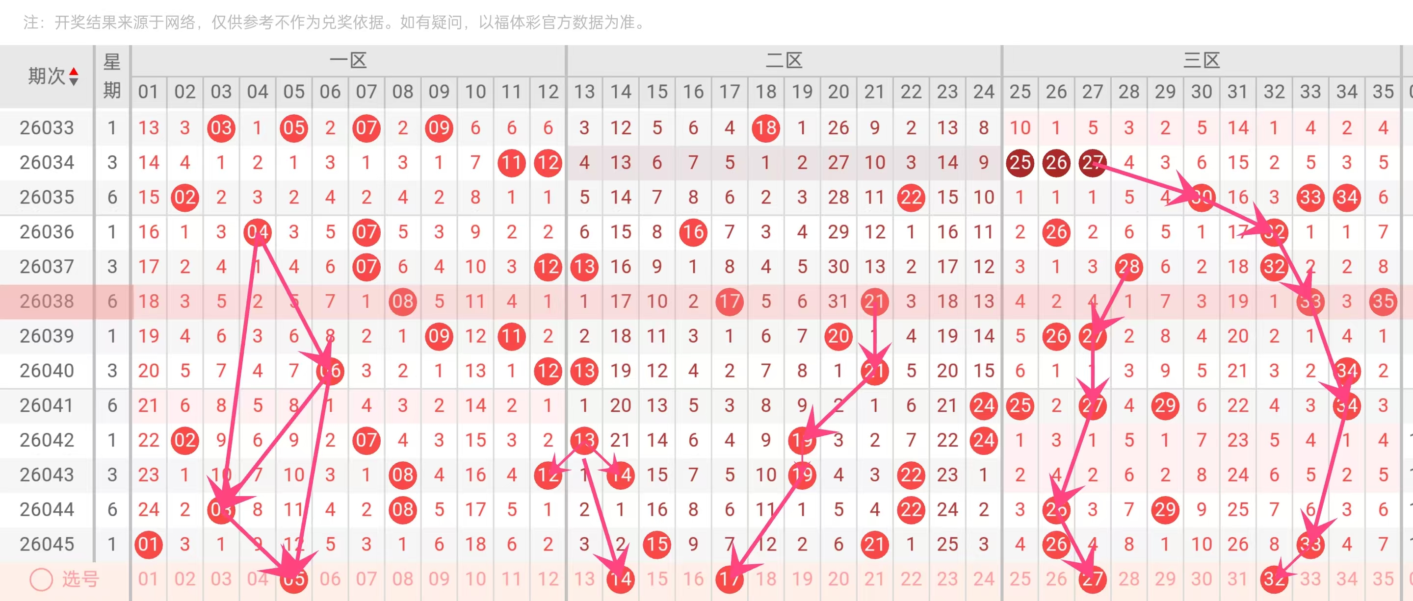 上期开出26、33,三区出号太多。我分析继续多,多多益善,具体号码如下:。