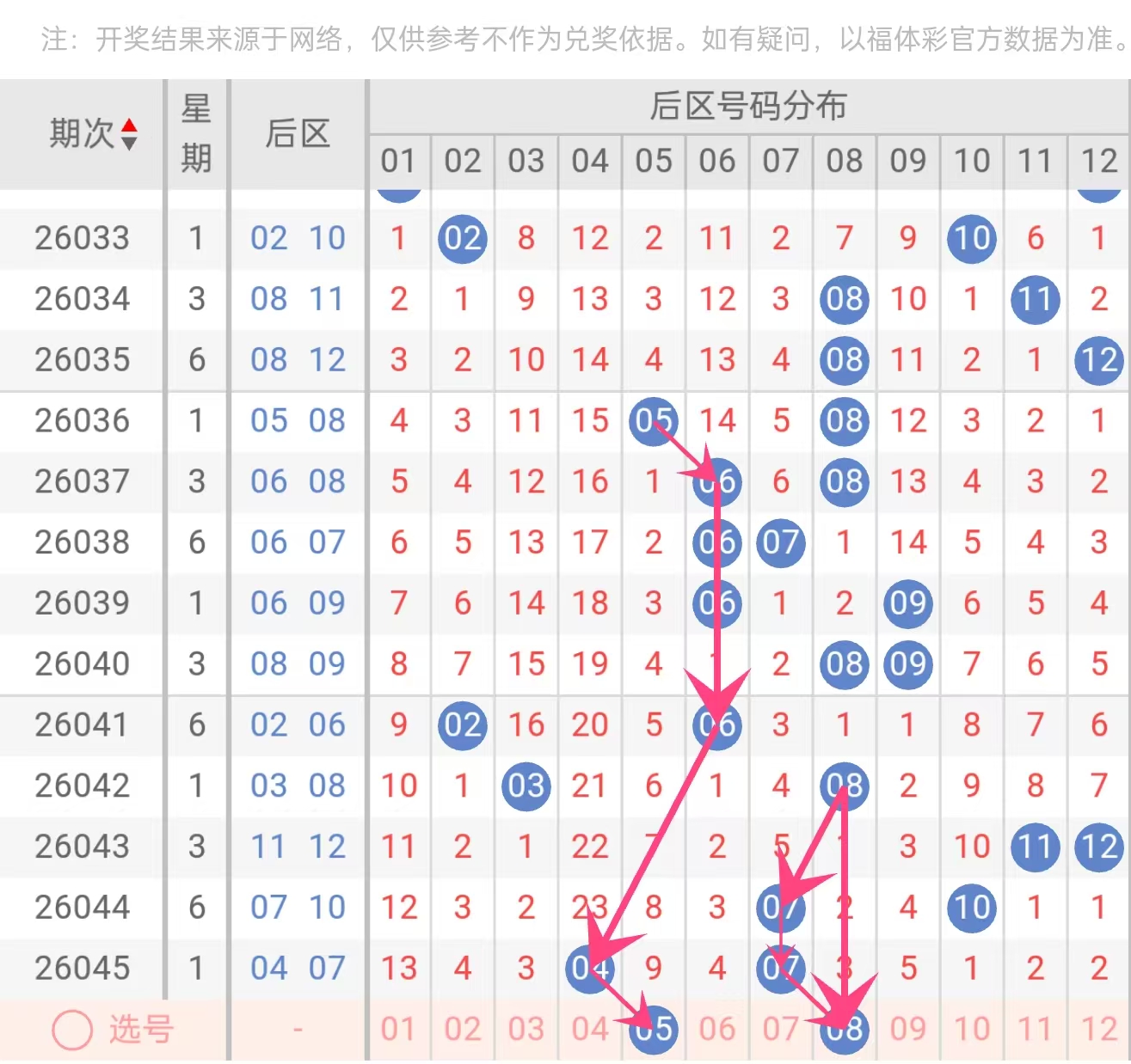 05、08:二者属于一路上的号,05是上期04的斜连号,因为上期两个数差值是3,本期继续看好差值是3,上期大号热,本期同样趋向大号。