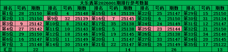近期开出最少的位置是第22 28位,对应本期号码是:25 26号