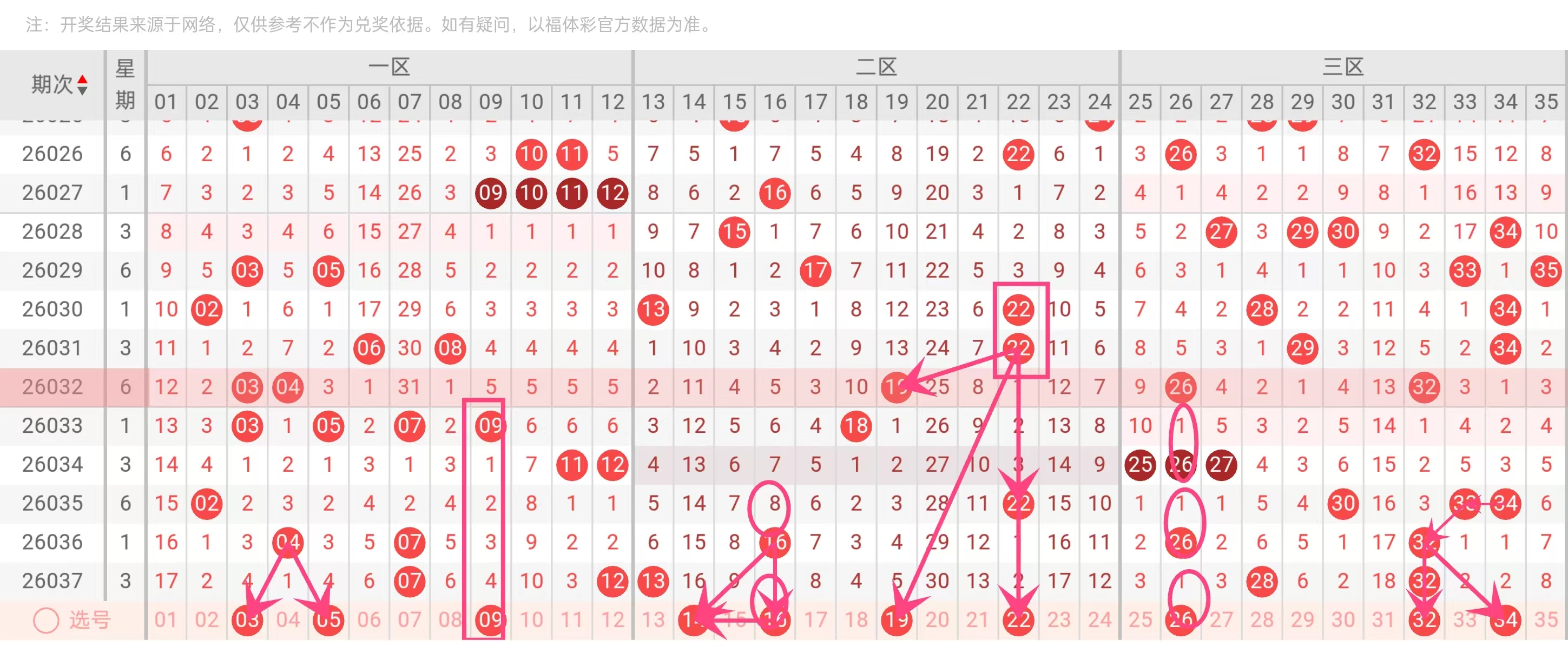 对称与镜像形态:观察近期号码分布,2026032开03、04、19、26、32,呈现小号对称(03-04)和大号分散。本组选取03(重号可能)、04虽被上期杀?但未杀04,不过本组未选04,选03作为重号候选;26为上期号码,可做重号;32为上期号码,可做重号。重号一般1-2个,这里03、26、32三个重号,实际选号时可取舍,保留03和26。另外,16与19形成间隔3的对称,22与26间隔4,34与32间隔2,形态丰富。