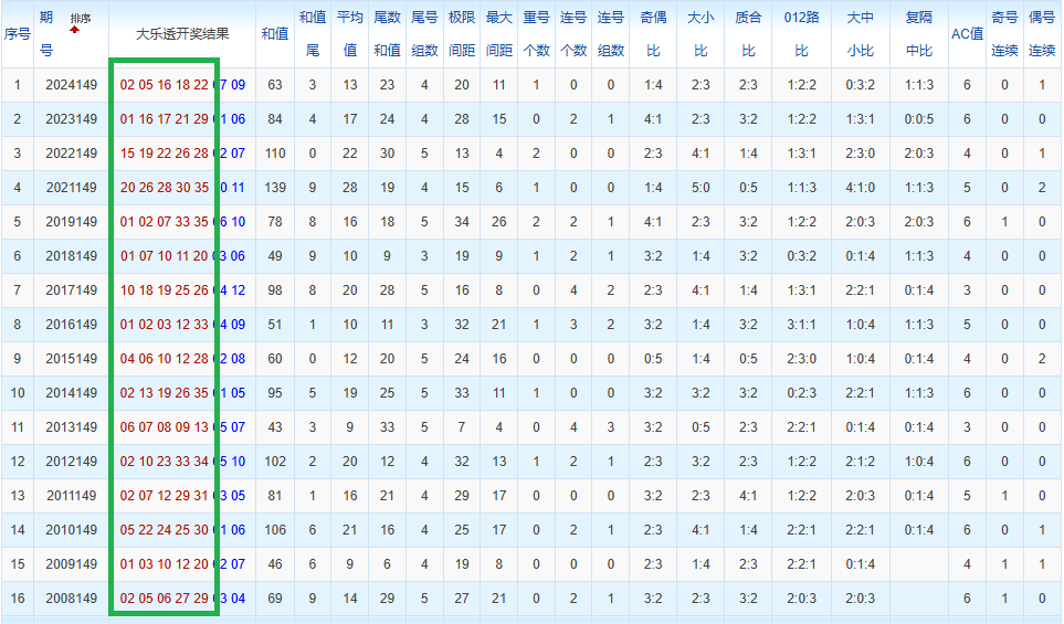 通过观察,我发现往年同期的开奖数据与本期号码之间存在显著关联。具体来说,在前区号码中,从第一位至第五位,通常会有约三个位置上的数字与往年同期相同位置的号码一致;而后区号码中,也有多期开奖结果直接包含了往年同期的数字。因此,我们可以借助往年同期各位置上的号码,作为分析本期开奖情况的重要依据。在此基础上,还可结合往年同期的其他相关条件,进行综合性的号码组合推荐。