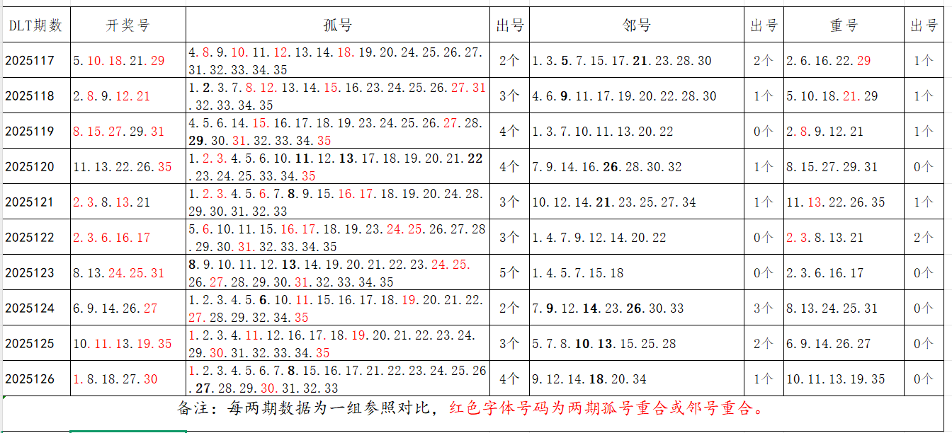 如图,以近两期数据为一组,进行对比分析,相同的孤号、邻号可能在下期开出。本期参考孤号:3.4.5.6.10.11.12.13.14.15.16.20.21.22.23.24.25.32.33;邻号:2.7.9.17.19.26.28.29.31。重点关注:孤邻号重合号码:***(会员专区可见)。个人分析,仅供参考。